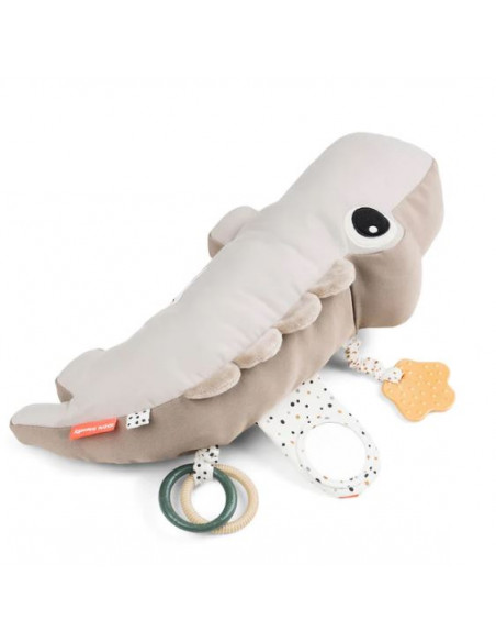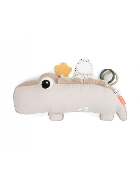 Ce coussin d'activités crocodile est juste superbe... avec son miroir, ses anneaux, ses étiquettes, le son froissé,...