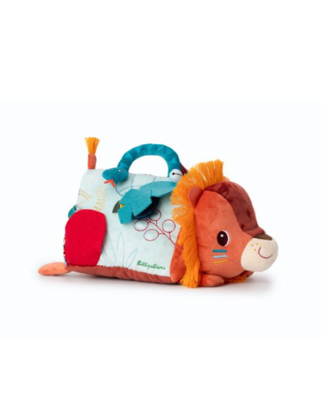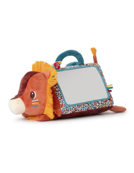 Bébé se met sur le ventre ? Jack le lion aussi ! Pour amuser et éveiller les plus petits, dès 3 mois, notre lion câlin se présente sous forme de triangle d'activités en tissu avec un grand miroir !