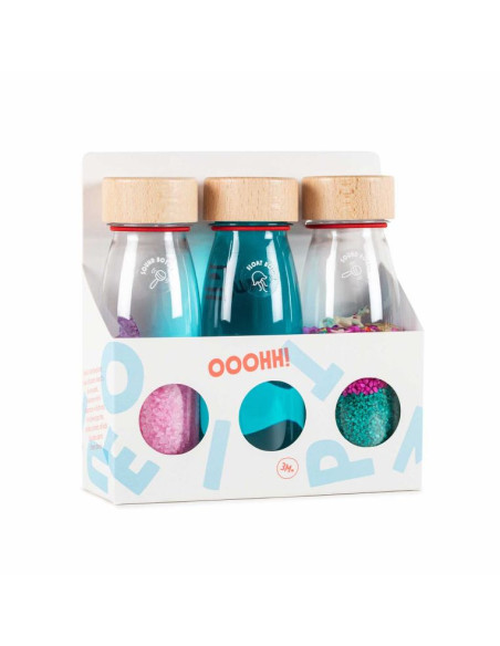 3 bouteilles sensorielles sur le thème de la vie : une bouteille sonore sirène, une bouteille sonore licorne et une bouteille flotteuse turquoise.