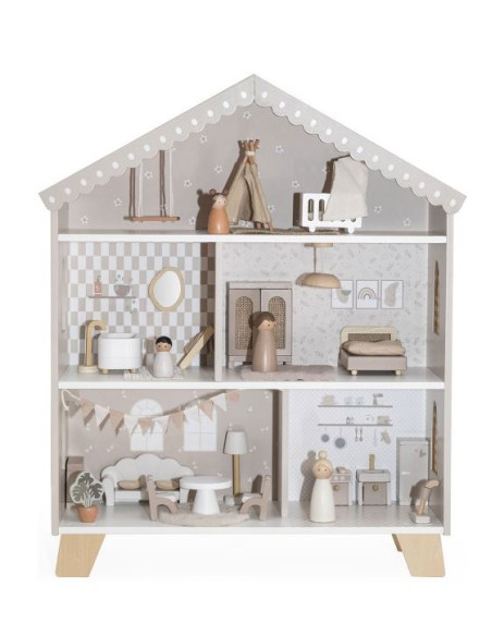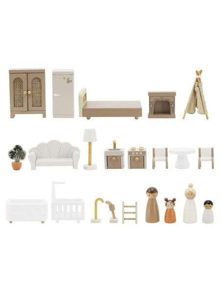 - Comprend des meubles en bois, des accessoires et une famille de poupées