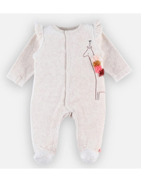 Pyjama 1 pièce, manches longues, beige en velours avec une girafe et des petites fleurs. Tout doux.