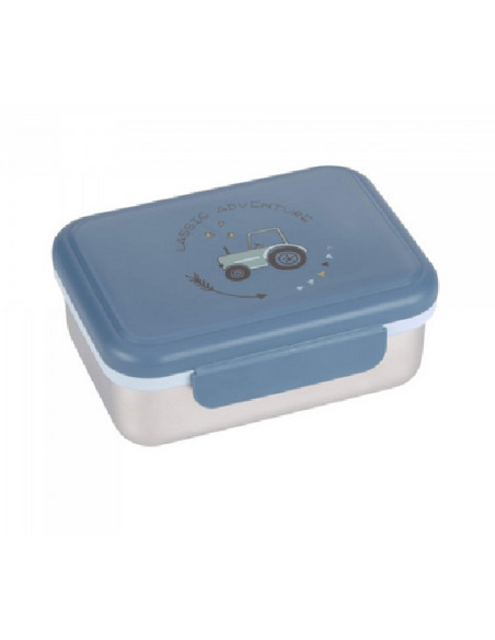 Boîte à goûter en acier inoxydable. Couvercle en polypropylène avec attache en silicone. Séparation amovible pour conserver plusieurs collations.