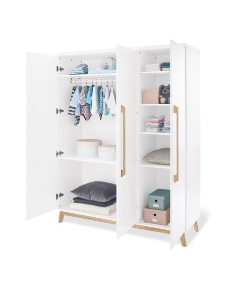Garde-robe 3 portes avec 6 étagères réglables et une tringle à vêtements.