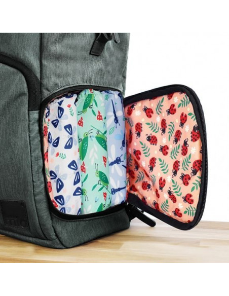Sac à dos pour couches lavables, muni de nombreuses poches intérieures et extérieures. Utilisable aussi en bandoulière ou avec une poussette.