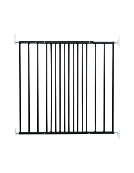Barrière de sécurité en metal à visser pour des ouvertures de 62,5 jusqu'à 106,8cm (installation à l'intérieur). Pas besoin de rallonges grâce à son propre système d'agrandissement. Hauteur: 72,5cm. La barrière s'ouvre des deux côtes et est facile à ouvrir avec une seule main.