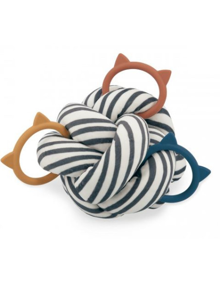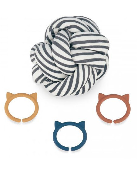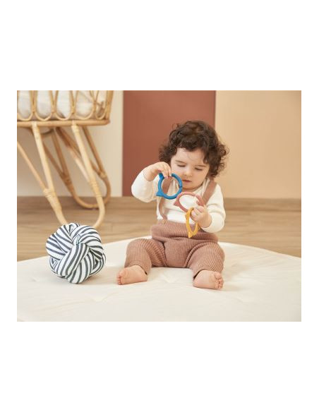 Une balle en forme de nœud dédiée à l'éveil sensoriel de bébé ! Adaptée dès la naissance, cette balle permet de stimuler la vue, le toucher et la préhension de bébé. Pour cela, elle présente une forme originale faite d'entrelacements, ce qui la rend facile à saisir par bébé et encourage sa motricité fine. De plus, ces motifs contrastés captivants permettent de stimuler la vue du tout-petit, qui perçoit mieux les contrastes à la naissance. Enfin, 3 anneaux en forme de chats donnent une dimension supplémentaire à ce jouet d'éveil : de couleurs variées, ils sont en silicone et peuvent être retirés et replacés sur la balle à votre guise. Les changer de place sur la balle régulièrement permet de continuellement attiser la curiosité de bébé, qui va adorer s'en saisir ! Ils font également office d'anneaux de dentition, toujours utile pour soulager les gencives douloureuses de bébé quand il fait ses dents. Ce jouet d'activité mesure 16 cm et sera idéal comme cadeau pour une naissance. Il participe au développement des sens de bébé, en douceur et à son rythme. Moelleuse et confortable, la balle est composée de micro-velours (polyester) et est rembourrée avec du polyester recyclé. Vous pouvez laver l'ensemble en machine à 30°, pour un entretien facile. Complétez dès à présent l’espace dédié à l’exploration de bébé avec un jouet d’éveil tout doux et pensé spécialement pour lui par des experts de la petite enfance ! Cette balle d'éveil sensoriel fait partie de la gamme Stimuli de KALOO, développer en collaboration avec des psychomotriciens pour aider bébé à développer ses compétences sensorielles et motrices dès la naissance.