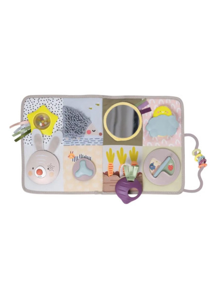 D'autres activités incluent une boule à cliquetis, des rubans colorés et diverses textures, un coup d'œil au soleil de Boo, un cliquet torsadé, des images coulissantes et un labyrinthe coloré pour développer la motricité.