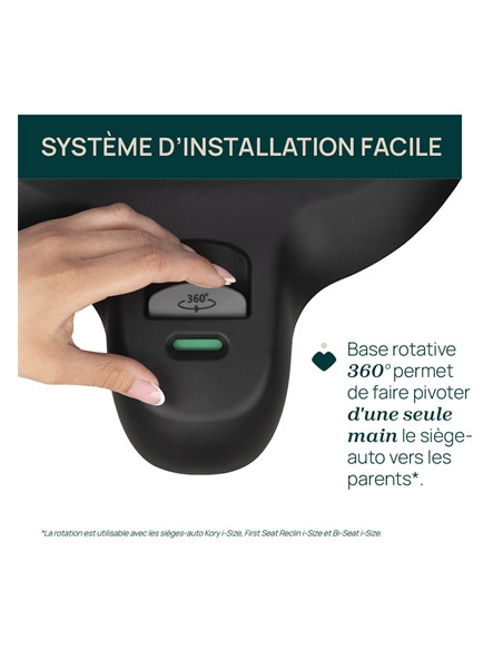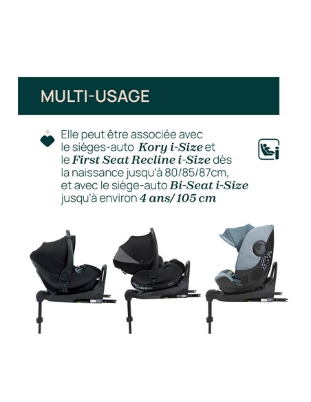 Base compatible avec : First-Seat Recline i-Size (40-87 cm), Kory Essential i-Size (40-80 cm), Kory Plus i-Size (40-85 cm), Bi-Seat i-Size (61-150 cm) et Fullseat i-Size (61-150 cm). Une seule base pour plusieurs sièges auto (système Full 360°).