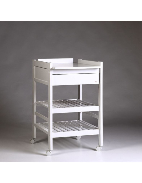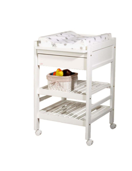 Table à langer en bois de bouleau massif pratique et fonctionnelle avec ses roulettes. Elle comprend deux étagères et un tiroir de rangement.