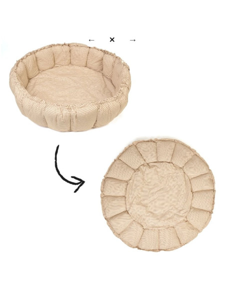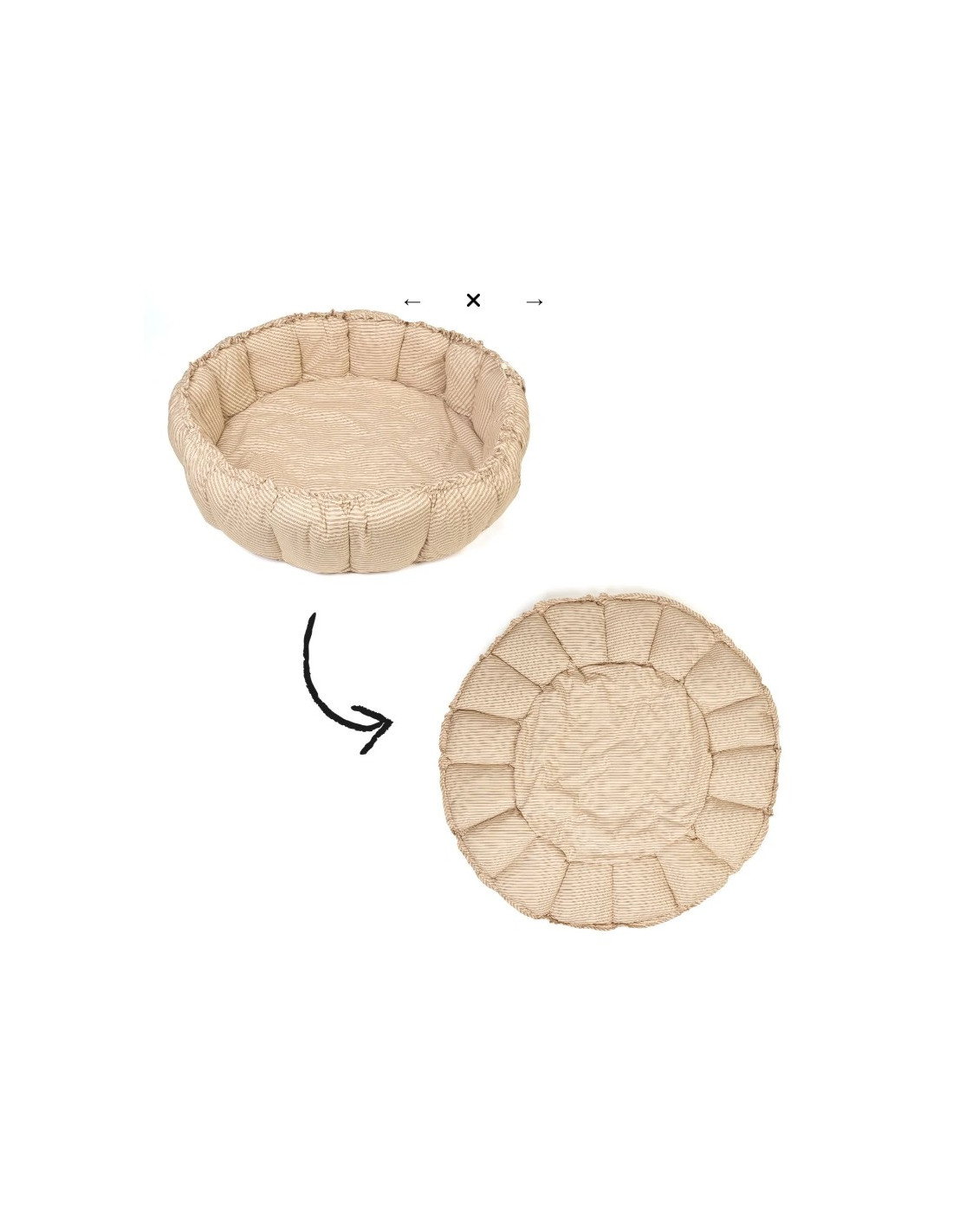 Simple d'utilisation, pour passer du mode tapis de jeux au mode aire de jeux, il suffira de soulever les pétales en tirant doucement sur les cordes puis de placer ces dernières à l'intérieur de la poche.