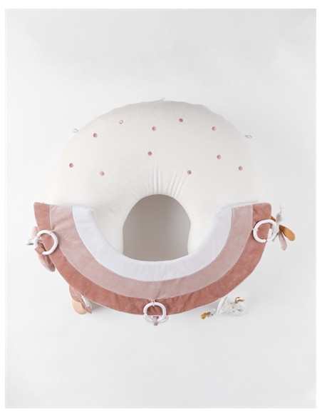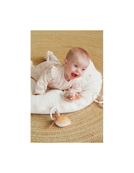 En position d’éveil, couché sur le ventre, bébé est encouragé à lever la tête, stimulé par les différents jouets à sa portée. Les jouets colorés aux formes différentes stimuleront sa vue, son ouïe, le toucher.