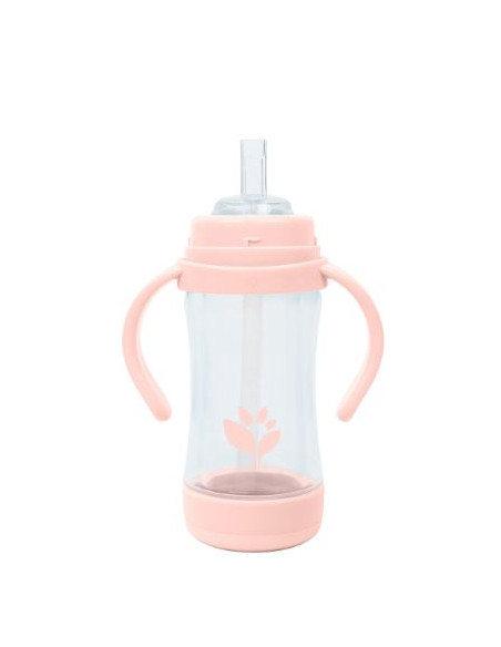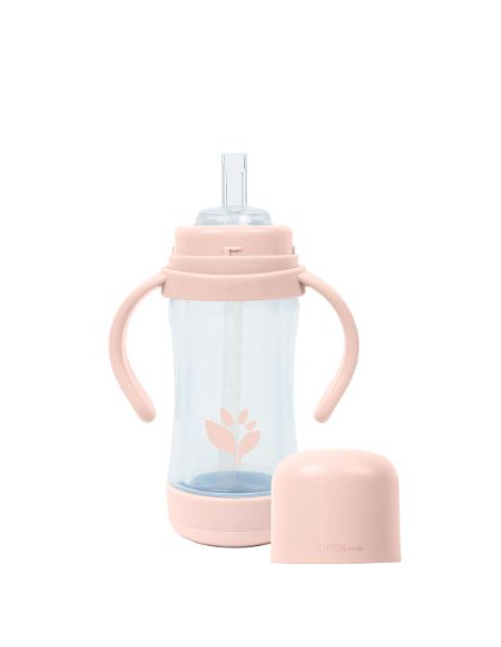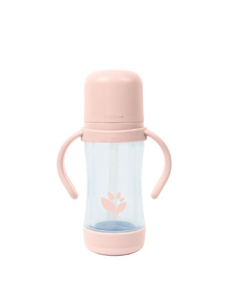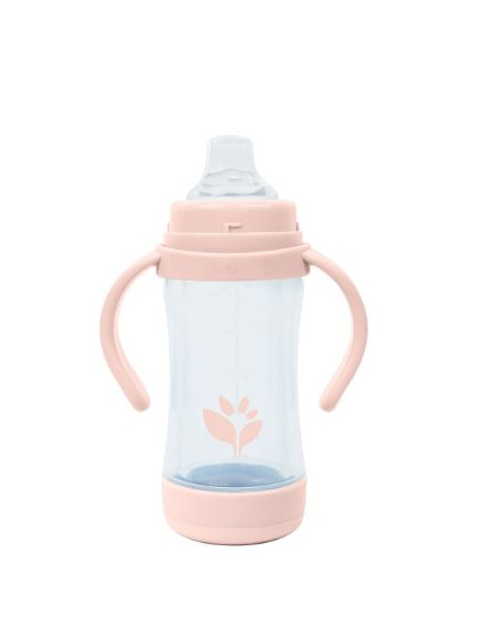 Tasse en verre dans un biberon en plastique avec paille et bec, avec anses.