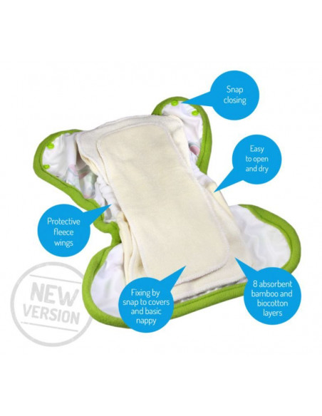 • L’insert en bambou de bonne qualité avec la possibilité de moduler l'absorption : pour les débuts, la base pliée suffit amplement. Ensuite, vous pouvez ajouter une doublure pressionnable pour augmenter l’absorption (fourni avec la couche).
