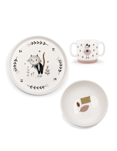 Coffret vaisselle en porcelaine, tendrement illustré pour manger comme les grands.