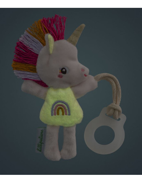 Plus qu’un attache-tétine, cette peluche Licorne peut aussi être utilisée comme doudou pour rassurer bébé tout au long de la journée. C’est aussi une extension qui lui permet d’attraper sa tétine plus facilement. Et quand vient la nuit, son petit ventre rond et ses oreilles brillent d’une douce lueur apaisante. Dans son format compact de 9 x 13 cm, cette Licorne en peluche est un concentré de douceur avec des teintes roses et une jolie frimousse ! Son attache en silicone est sûre pour les petits, dès la naissance. C’est le petit accessoire doux et malin qu’il vous fallait, ou qui fera plaisir aux parents, pour des nuits plus paisibles !