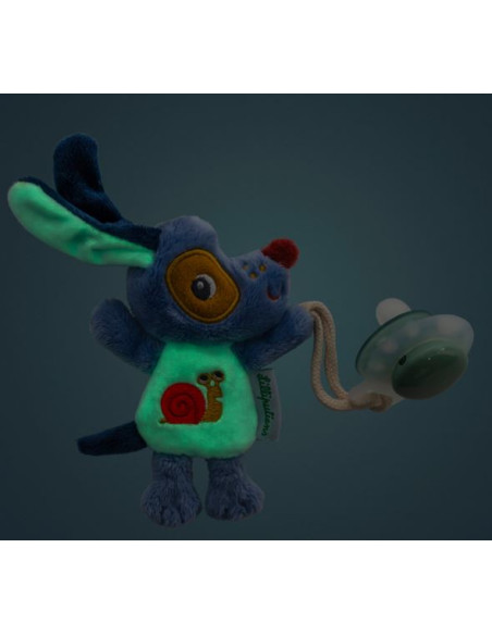 Plus qu’un attache-tétine, cette peluche chien peut aussi être utilisée comme doudou pour rassurer bébé tout au long de la journée. C’est aussi une extension qui lui permet d’attraper sa tétine plus facilement. Et quand vient la nuit, son petit ventre rond et ses oreilles brillent d’une douce lueur apaisante. Dans son format compact de 9 x 13 cm, ce chat en peluche est un concentré de douceur avec des teintes bleu et une jolie frimousse ! Son attache en silicone est sûre pour les petits, dès la naissance. C’est le petit accessoire doux et malin qu’il vous fallait, ou qui fera plaisir aux parents, pour des nuits plus paisibles !