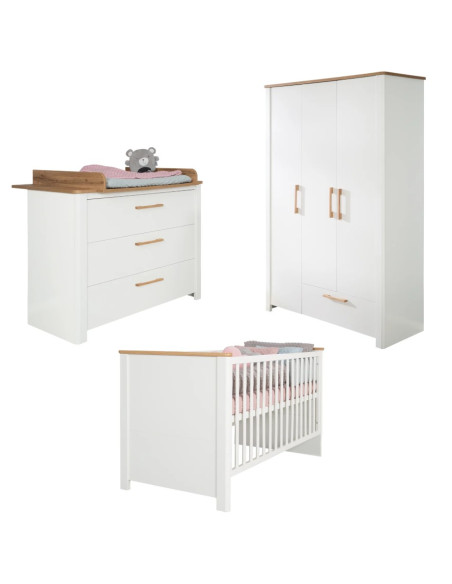 L'ensemble de chambre d'enfant 3 pièces 'Ava' se compose d'un lit bébé, d'une large table à langer avec une pièce à langer amovible et d'une armoire à 3 portes.