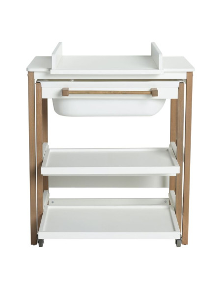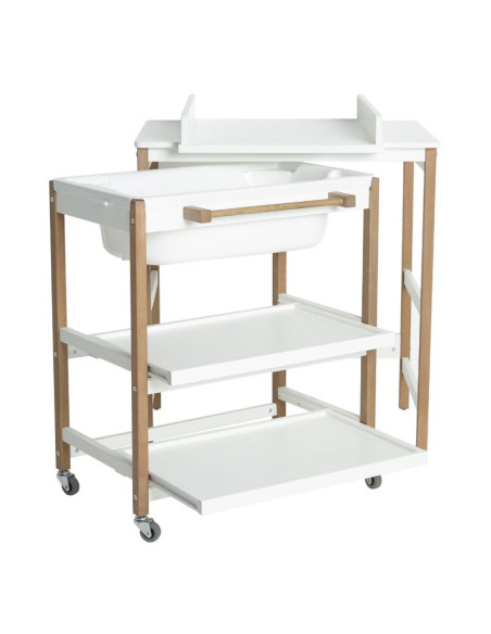 Meuble de bain avec baignoire rigide, tuyau de vidange et table à langer. Emboitage pour économiser de l'espace après utilisation.