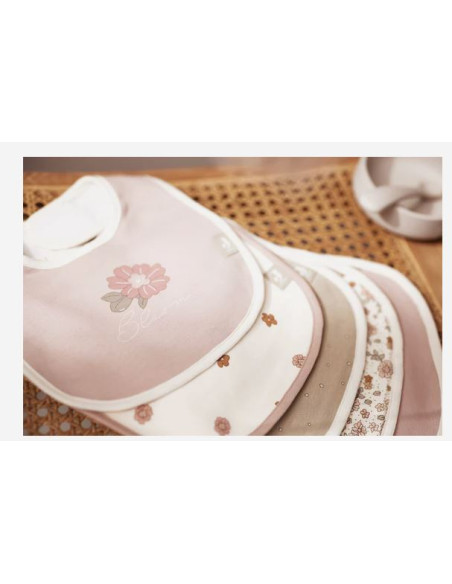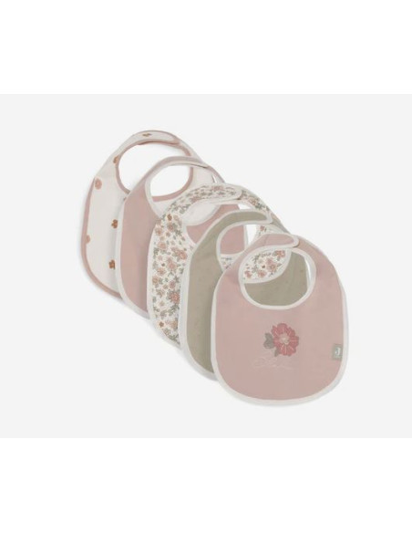Lot de 5 bavoirs imperméables avec fermeture velcro décorés de motifs floraux.