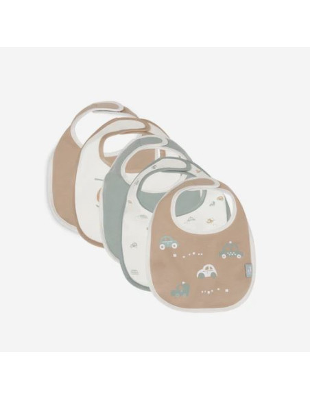 Lot de 5 bavoirs imperméables avec fermeture velcro décorés de motifs véhicules.