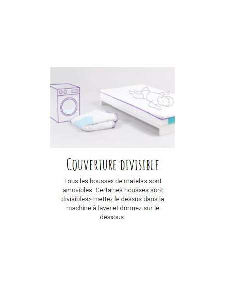 Le plus : Non seulement déhoussable mais aussi totalement divisible. Ainsi, en cas c'accident, vous pouvez utiliser l'autre moitié de la housse pour remettre sur le matelas pendant que la partie souillée est en machine.