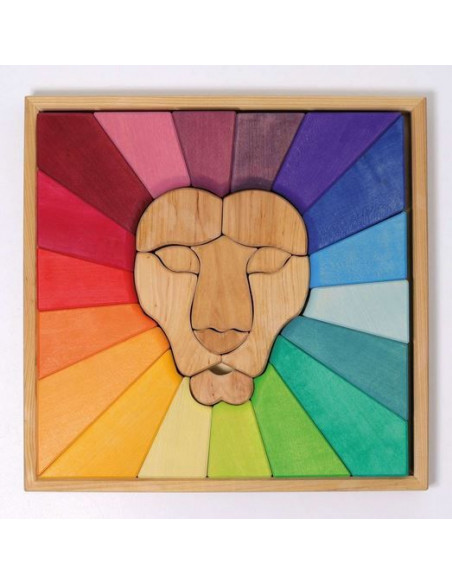 Magnifique puzzle géant "Hakuna Matata" de la marque Grimm's. Dimensions: 44,5 x 44,5 cm! Contient 27 pièces en bois naturel qui servent également de jeu de construction.