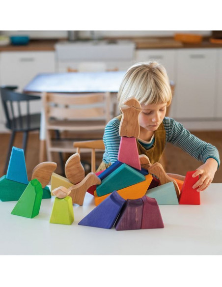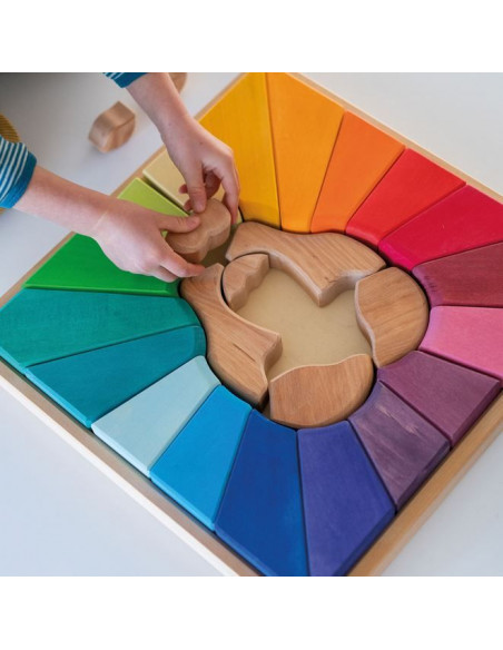 La marque Grimm's produit des jouets en bois naturels et durables. En conséquence, ces jouets ont toujours des marques uniques, car le grain de bois a des structures et des couleurs changeantes qui servent de preuve de ses origines naturelles. Les variations uniques sont la preuve de la qualité du jouet et non d'un défaut.