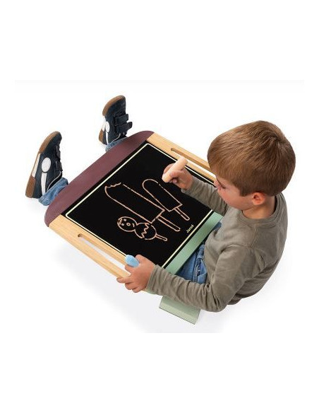 Cette grande ardoise de table en bo se transporte et se place facilement sur son socle anti-dérapant. Une face ardoise noire pour les craies et d’une face blanche pour le feutre effaçable. Bien pratique,
