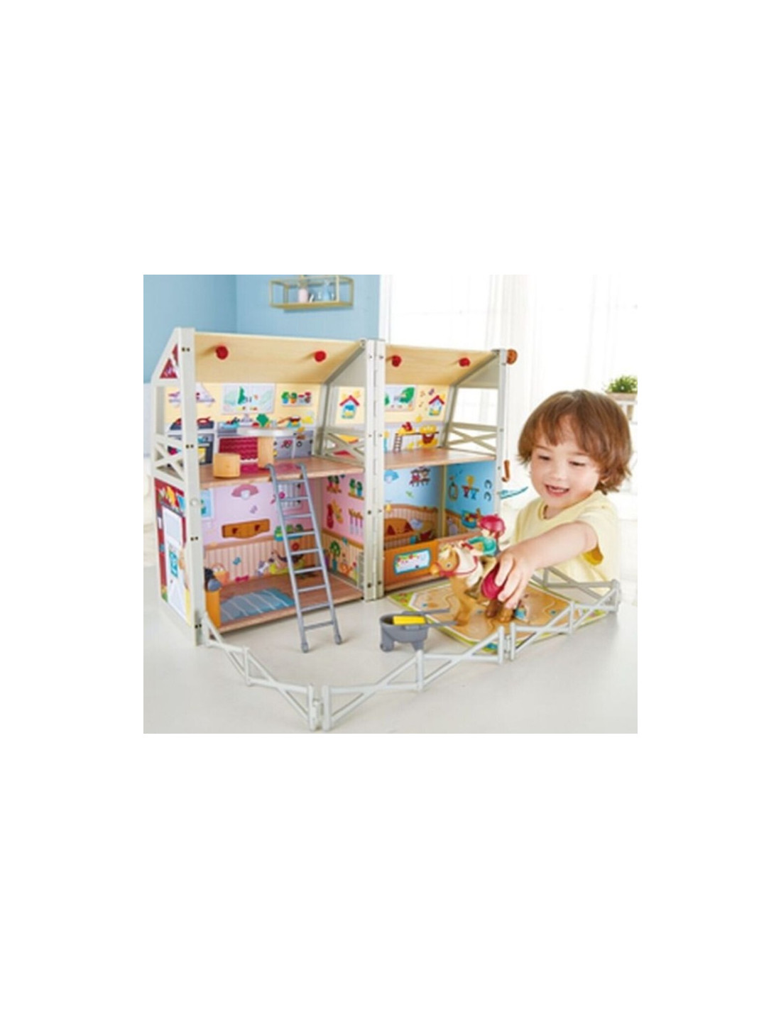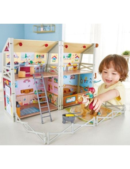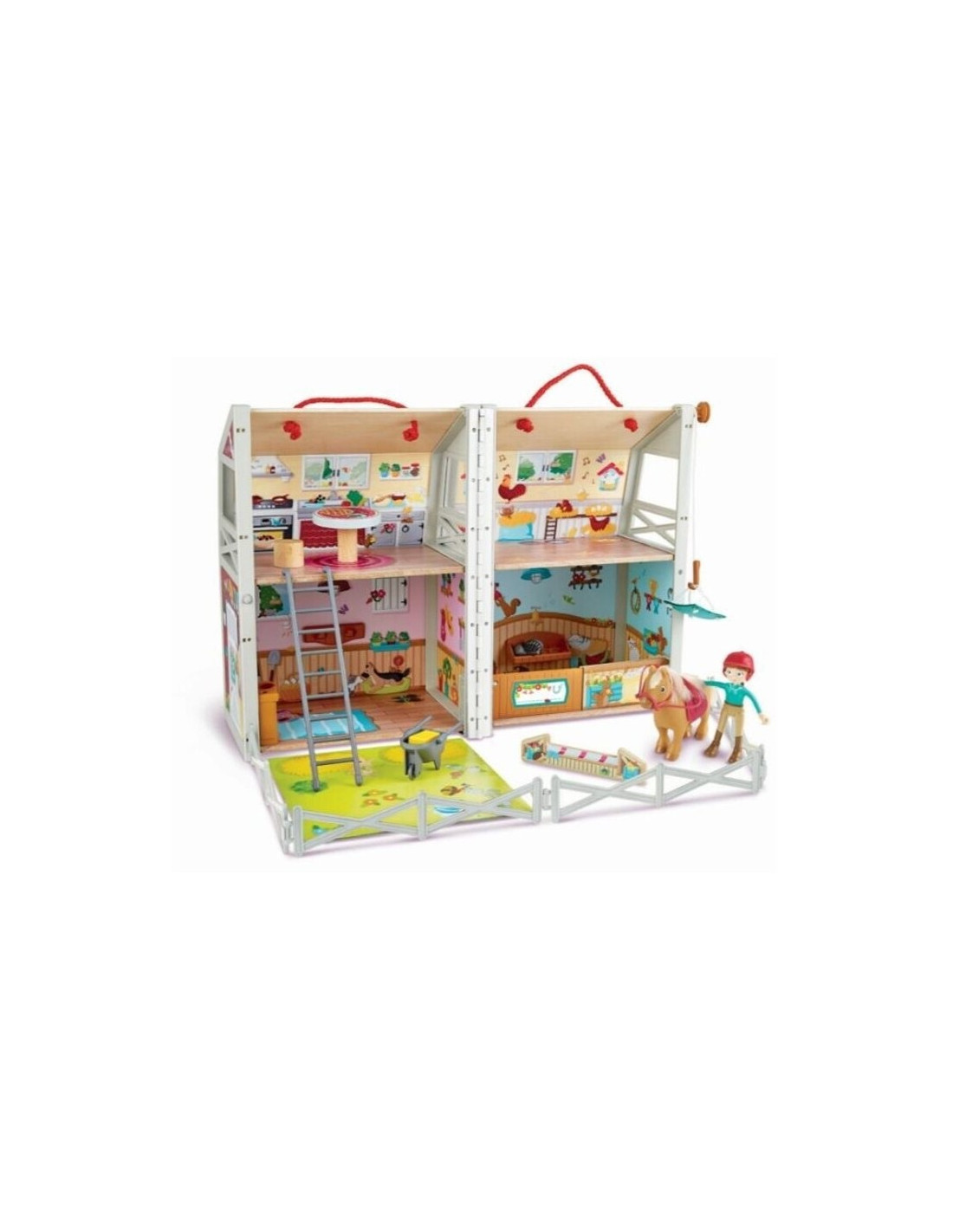 Cette écurie compacte et facile à ranger comprend deux niveaux et de nombreux accessoires de pansage et d'équitation.