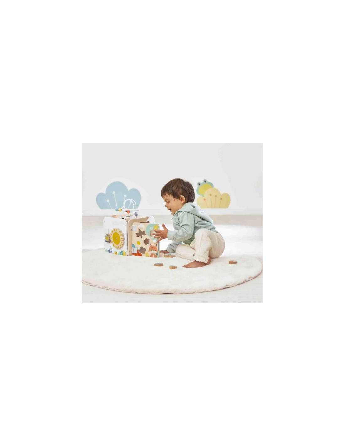 Un dernier détail amusant vient compléter ce joli cube : 1 grenouille s'est installée près du soleil ! Et quand elle saute… le soleil se met à tourner ! Un vrai petit tour de magie mécanique qui amuse bébé et l’aide à comprendre le lien entre ses gestes et leurs effets.