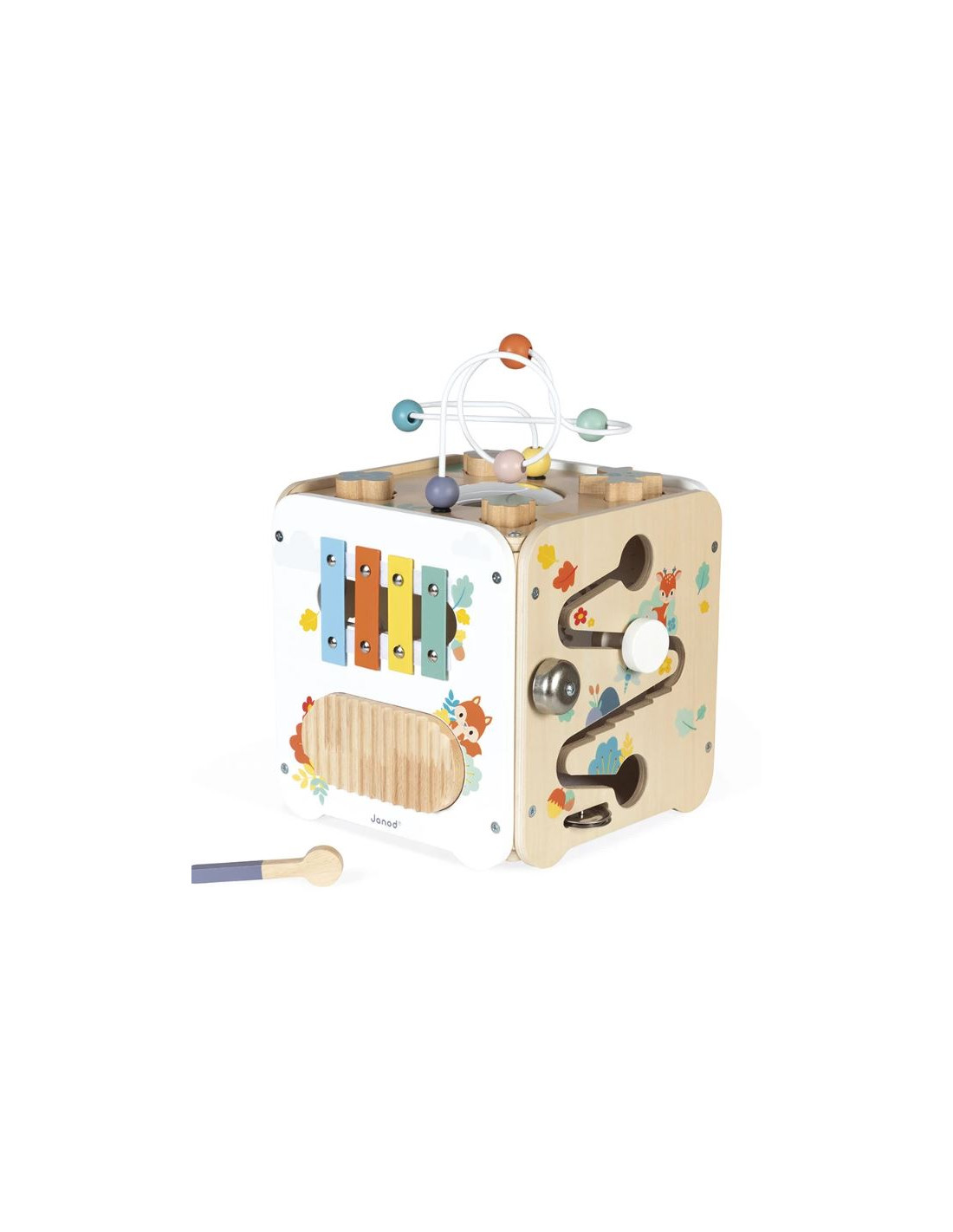 Grâce à ses charnières souples en plastique, la porte peut être repositionnée facilement en cas de déboîtement. Ce cube d'activités invite bébé à explorer, manipuler, écouter et observer ce qui l'entoure.