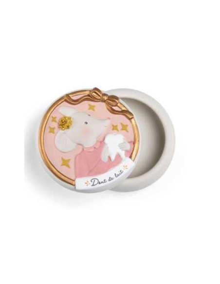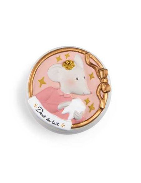 Délicate boîte à dents de lait en résine aux couleurs de la gamme avec en volume le portrait de la souris de la collection qui gardera précieusement les premières quenottes de bébé.