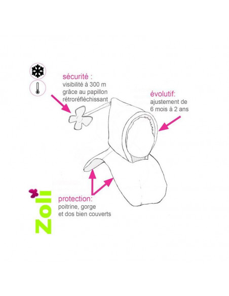 Grâce à un élastique de réglage, il évolue avec bébé pour protéger ses oreilles, gorge, poitrine et dos.