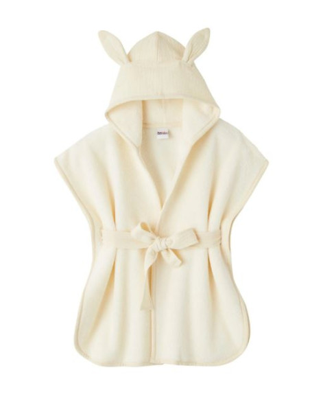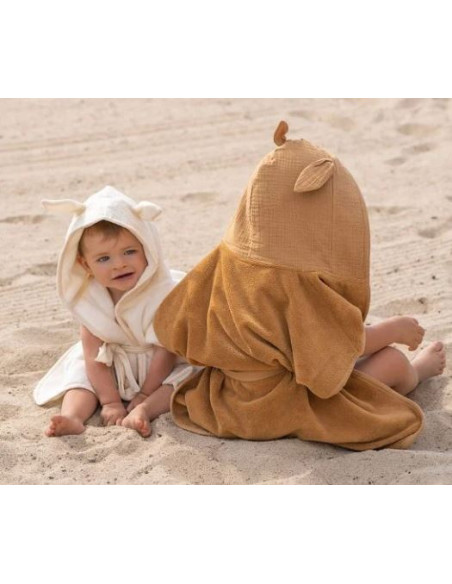 Un adorable peignoir en éponge bambou avec capuche et ceinture en double gaze de coton ton sur ton.