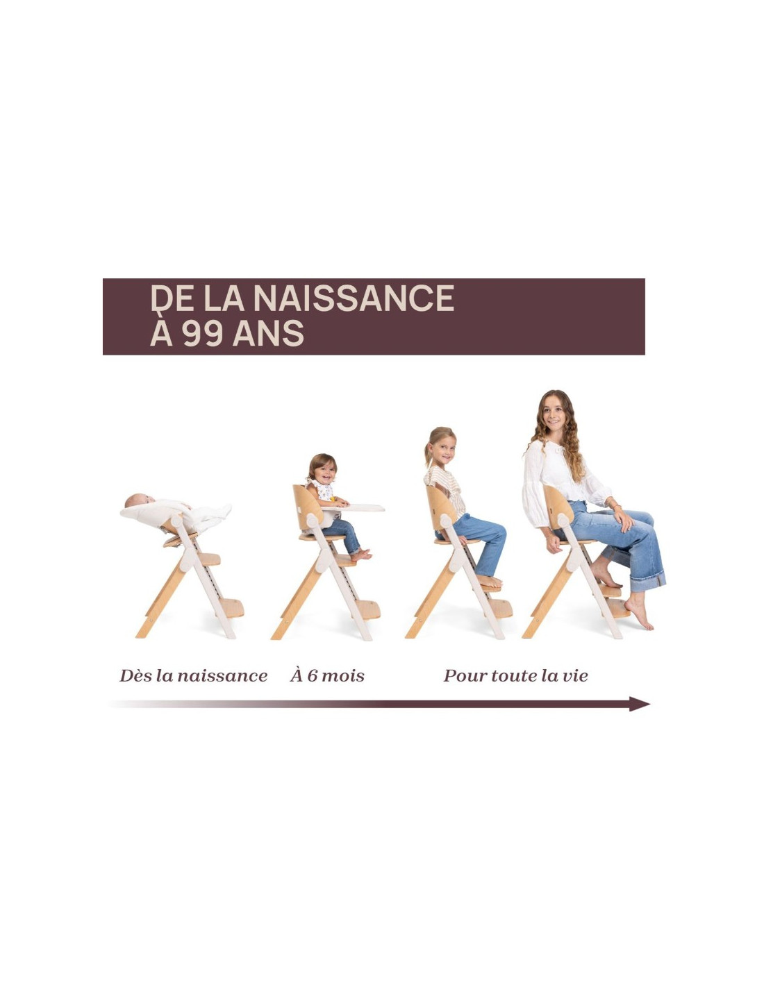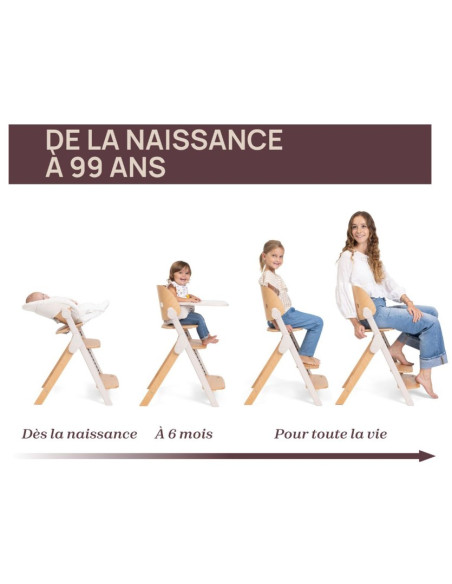 - Chaise évolutive avec 4 configurations : transat grâce au dossier inclinable, chaise haute, chaise enfant et chaise adulte.