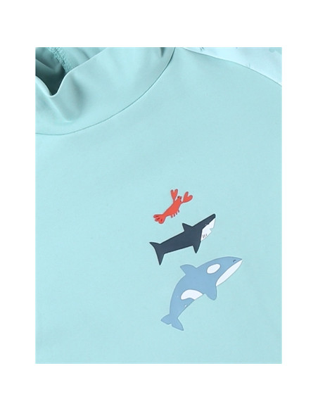 La combinaison protection UV bleu aqua à imprimés marin protège votre enfant des rayons UVA et UVB.