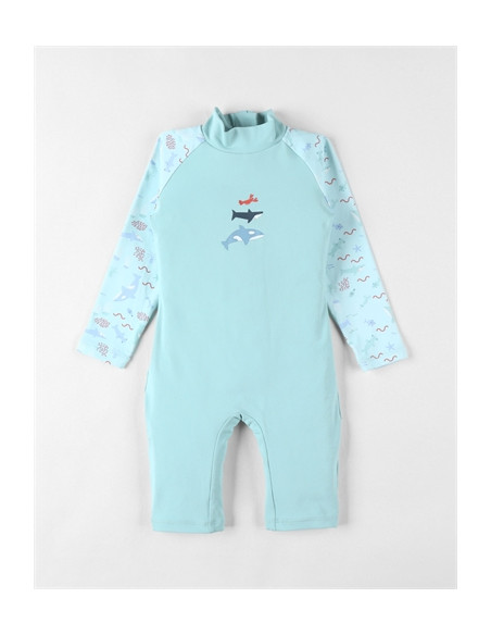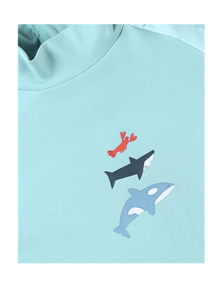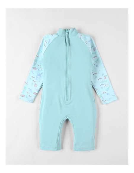 La combinaison protection UV bleu aqua à imprimés marin protège votre enfant des rayons UVA et UVB.