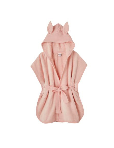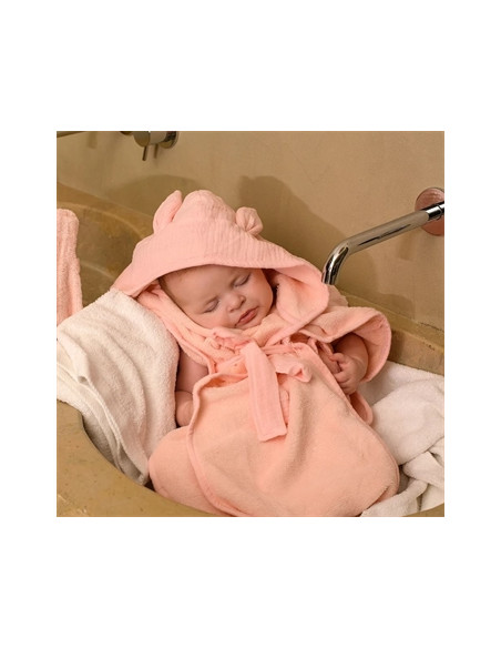 Un adorable peignoir en éponge bambou avec capuche et ceinture en double gaze de coton ton sur ton.