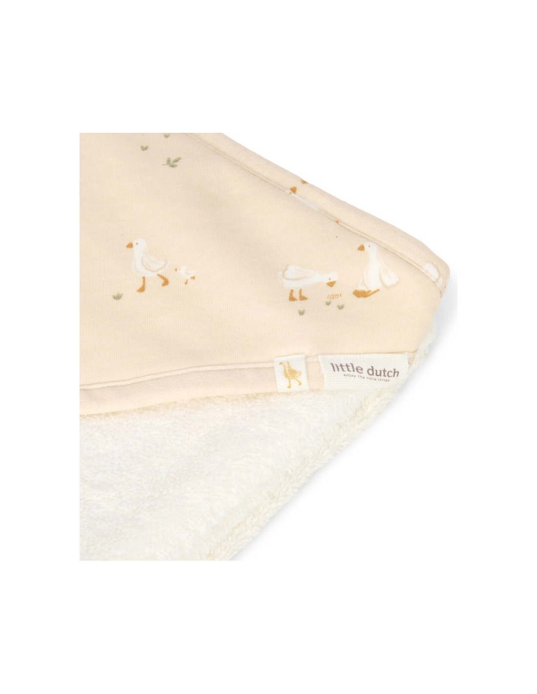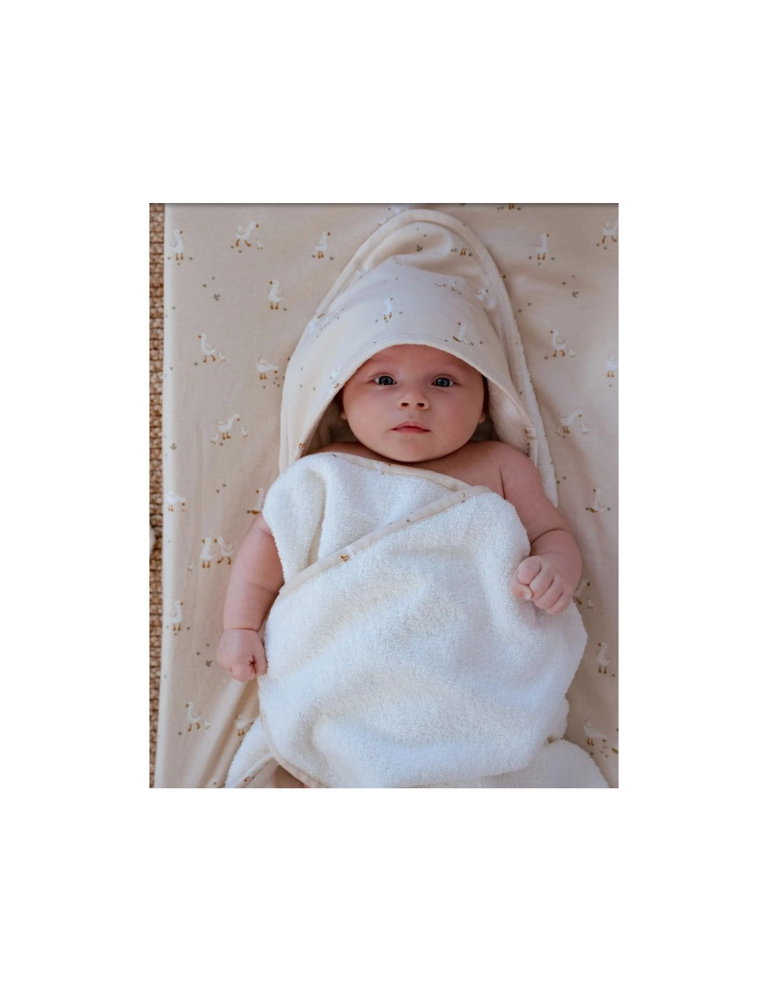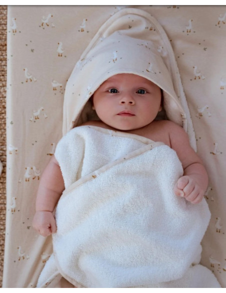 Fabriqué à partir de tissu éponge 100 % coton biologique pour une sensation merveilleusement douce et confortable. Conçue pour un usage à la fois pratique et charmant, la capuche douce offre sécurité et confort après le bain. La serviette a une belle couleur sage et la capuche est décorée de petites oie.