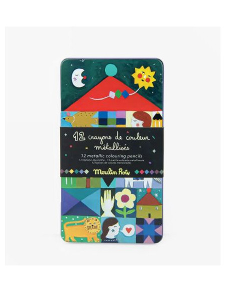 Vive la couleur ! 12 crayons de couleurs métallisés inspirés par l'univers Les comètes filantes. La boîte en métal joliment illustrée par Julie Daleyden est parfaite pour protéger les crayons et les emporter partout avec vous.