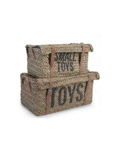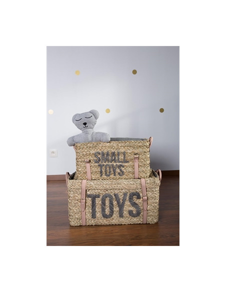 Sur le plus grand panier, il est écrit "Toys" et sur le plus petit "Small toys".