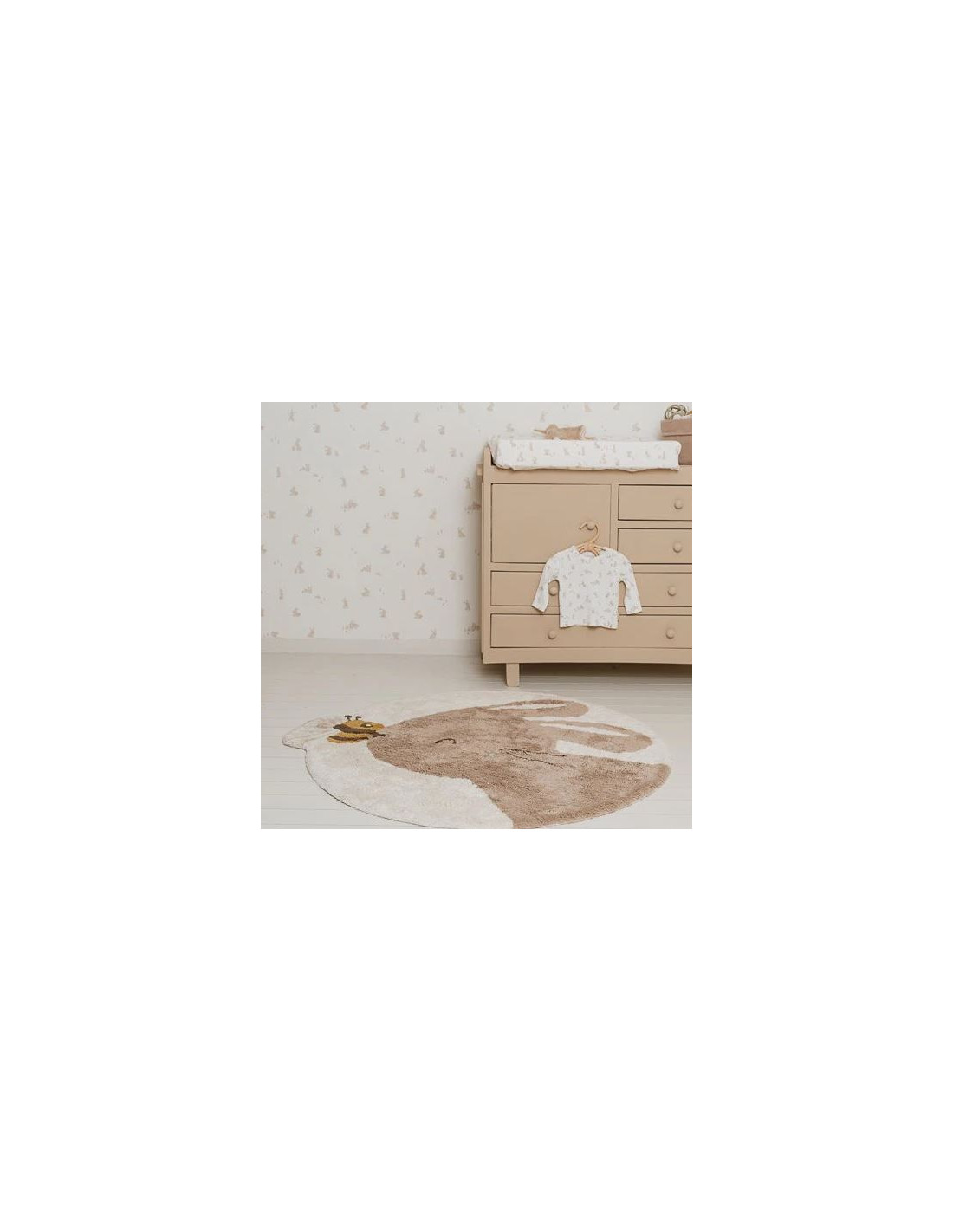 Ce tapis en forme de lapin mignon a une teinte beige neutre et a une petite abeille sur son nez.