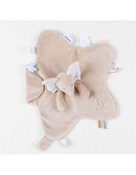 Cube d'activités en 100% coton avec un miroir, un pouêt, du papier froissé, un anneau de dentition, un hochet avec billes, une clochette et des étiquettes.