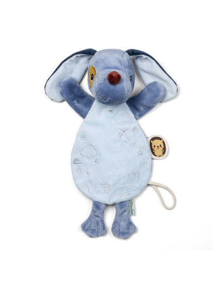 Bébé emporte son doudou bleu partout et reste confiant et apaisé tout au long de la journée. C’est aussi un doudou marionnette ! Glissez vos doigts dans les bras et derrière la tête du chien, et c’est parti pour le spectacle ! Saviez-vous que notre cher Jules est un aviateur hors pair ? Faites-le voltiger, chanter des comptines, jouez à « coucou-caché » … De quoi divertir votre tout petit et partager de chouettes moments de complicité ! Mais ce n’est pas tout : c’est un doudou phosphorescent. Après une journée placée sous le signe du jeu et des câlins, place à une bonne nuit de sommeil paisible. Avec un doudou qui brille dans le noir, bébé est rassuré dans la pénombre et ne le perd jamais. Eteignez la lumière, et observez le ventre et les oreilles de ce doudou brodé : quelle belle lueur apaisante ! Le petit plus de ce doudou Lilliputiens, c’est la boucle attache-tétine intégrée, idéale pour ne jamais la perde de jour comme de nuit. Pour inscrire les informations du petit propriétaire de ce doudou chien, une étiquette en forme de hérisson est prévue.