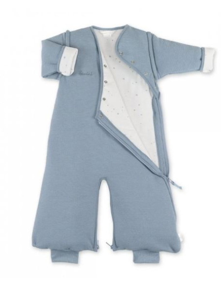 Possibilité de séparer les jambes grâce aux fermetures éclairs. Permet une plus grande sécurité en voiture car les ceintures et le harnais de sécurité sont attachés au plus près du corps de bébé. Les jambes réunies permettent un confort et une tranquilité de bébé.