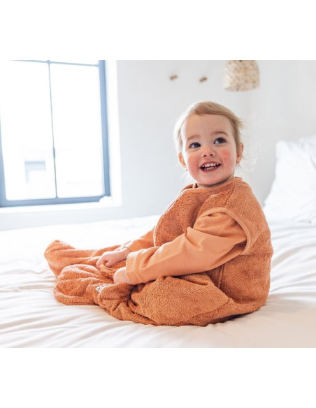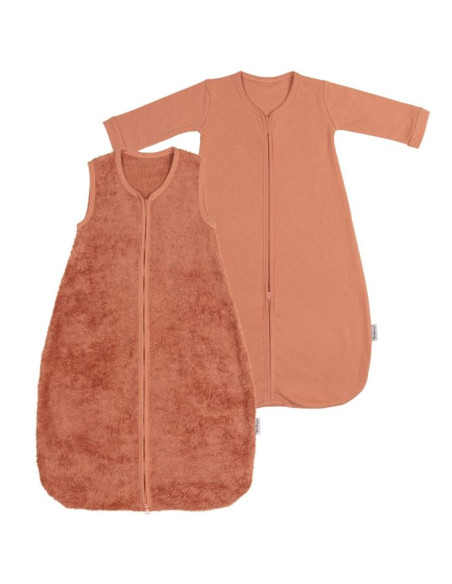 Le sac intérieur, doté de manches, est fabriqué en jersey de bambou, tandis que le sac extérieur est sans manches et conçu en tissu éponge de bambou, parfait pour être porté par-dessus le premier.