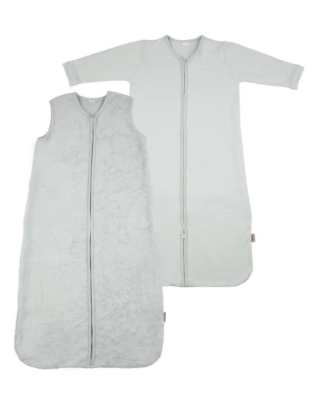 Le sac intérieur, doté de manches, est fabriqué en jersey de bambou, tandis que le sac extérieur est sans manches et conçu en tissu éponge de bambou, parfait pour être porté par-dessus le premier.