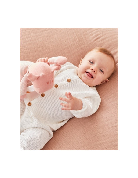 Ce petit cardigan gris en tricot BIO tout doux de la collection Mix & Match est idéal pour la mi-saison pour garder votre enfant bien au chaud. Il se ferme à l’aide de petits boutons.