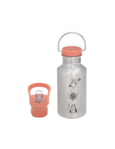 Gourde en acier inoxydable incassable et anti-fuites. Fournie avec un bouchon classique et un bouchon sport.