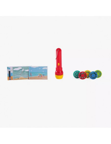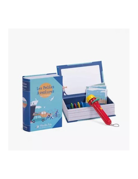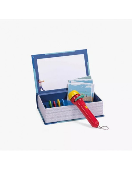 Ce coffret magnétique avec écran de projection est conçu comme un livre. Il contient 1 lampe à projeter, 5 disques de petites aventures poétiques et 5 petites cartes postales illustrées.